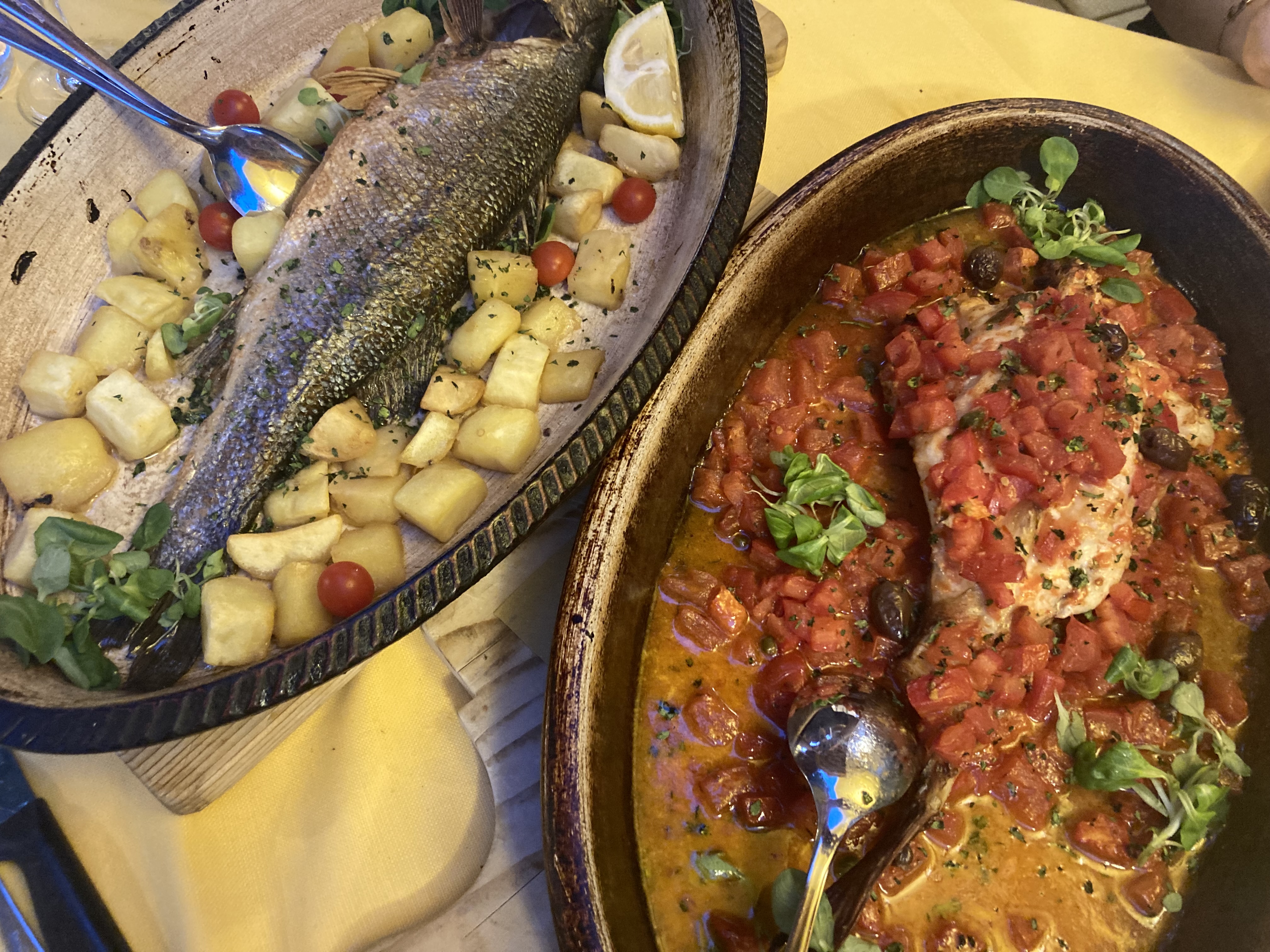 Das Lokal bietet zwei unterschiedliche und sich ergänzende Bereiche: eine Panoramaterrasse mit Meerblick, ideal, um beim Abendessen die Farben des Sonnenuntergangs und die Meeresbrise zu genießen, und einen charakteristischen Innenraum, gemütlich und mit Liebe zum Detail eingerichtet, perfekt auch an kühleren Tagen.